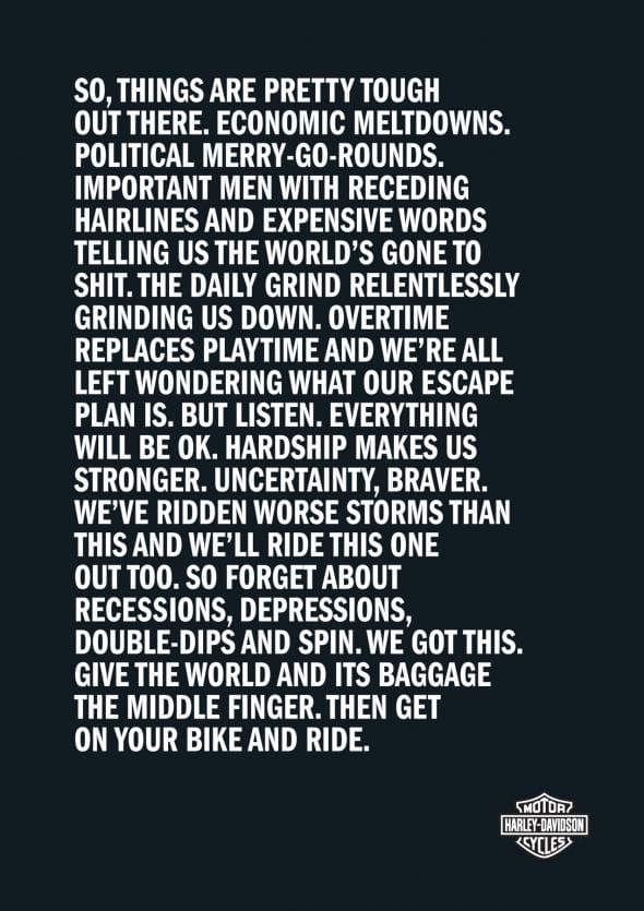 Aunque no va en la misma línea, ya que el anuncio que es protagonista de nuestro blog hoy, el último de Harley-Davidson no está pensado para el mercado español retoma sa idea de que por muy mal que estén las cosas ahí fuera, y por muy mal que la economía vaya, siempre tendremos pequeños detalles a los que aferrarnos, detalles que nos demuestran lo bueno de la vida.