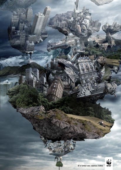 Esta mismo eje de comunicacion es el que utiliza WWF en la siguiente publicidad gráfica: «Si el árbol cae, caemos todos» y «Si el hielo cae, caemos todos»
